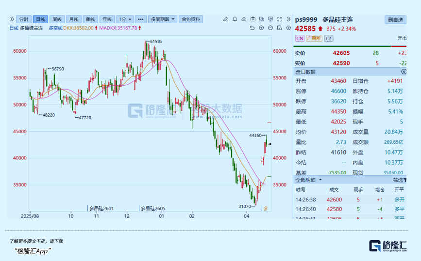 就在上周,市场多次传出有关多晶硅“控产挺价”的小作文,持续刺激资金入场炒作。多晶硅期货主力合约也从4月10日3.1万元/吨的阶段性低点,一路猛涨至超4.4万元/吨,短短几个交易日涨幅超45%。