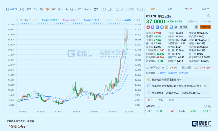 还有全球最大电解铝民营企业巨头,在港股上市的中国宏桥,其股价从2020年底部以来累计涨幅甚至高达10倍(前复权)。
